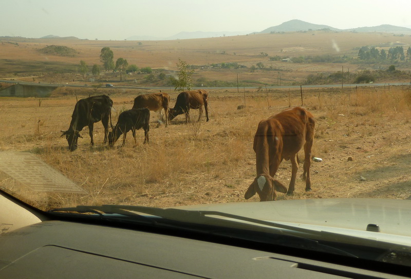 Here are also three pictures I took from the car while I was driving. The first gives an impression of the scenery, the second of the special road condition (You are not supposed to stop, so speeding is no problem 🙂 and the third of bovine road blocks!
