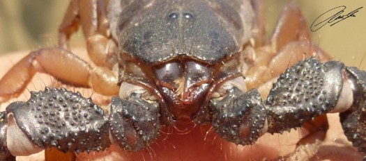 This Scorpion came very close when I was trying to take a picture (lying flat on the ground). The good thing is that he is of the harmless kind. This species (Opistophthalmus glabrifrons of the family Scorpionidae) is large and has very impressive pedipalps, but only very weak venom in his tail sting.