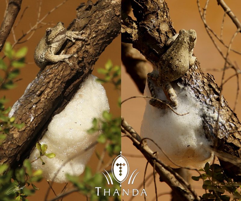 Nests of Foam-nest Tree Frogs are very important “bush signs”. These type of Frogs build bright white nests on branches above water. They mate in what is described as polyandry. The simultaneous polyandry begins when a female releases eggs onto a tree branch. Up to 12 males then cluster around her and fertilize the eggs by producing sperm which they whip into a foamy ‘nest’ with their hind legs.