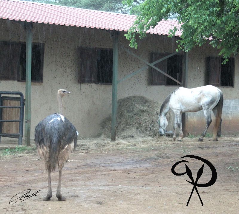 Well, don’t laugh, but the horses are not strong enough for a portly gentlemen like me (the rider weight limit is 90kg=200lbs), but I still enjoyed my stay very much. The weather was bad – it rained very hard – but we still went for a short game drive and had a look at the scenery and at the stables with over 30 horses (the picture shows one of the Horses with one of the free roaming Ostriches on the property).