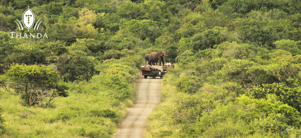 This picture shows the Thanda Elephant herd crossing a road in front of two game drive vehicles.