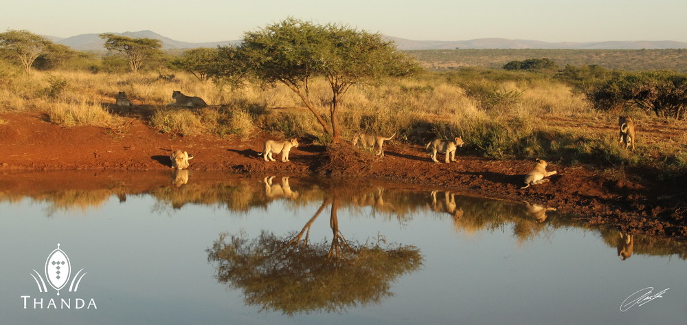 The Thanda North Pride stopped for a morning drink at a small dam on the savanna area. The cubs are now almost a year old and their aunts and uncles almost two, but all of them were very playful this morning. A great sighting!
