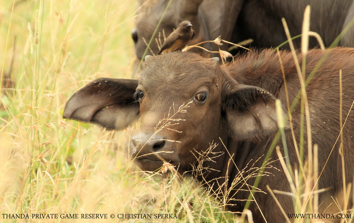 This was a very cute Thanda sighting. The little Buffalo calf was “hosting” a Red-billed Oxpecker chick. They were posing for this portrait for quite a while.
