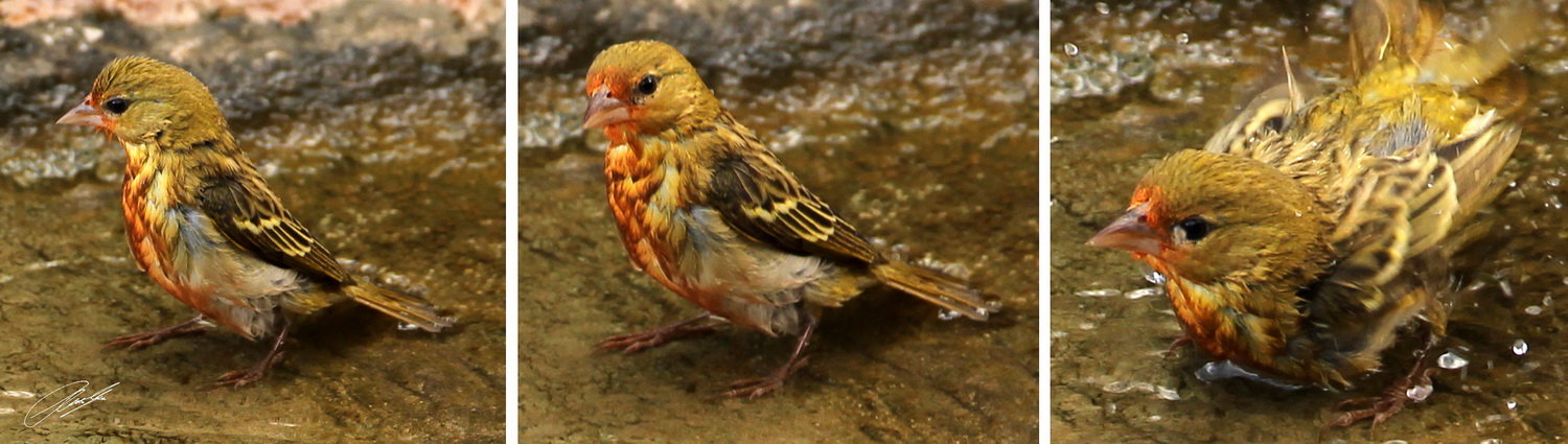 1. We got the answer 🙂 It seems to be a Village Weaver female which had indulged herself in an Aloe pollen feast – hence the orange color. Thanks for your comment!