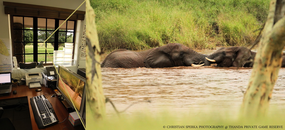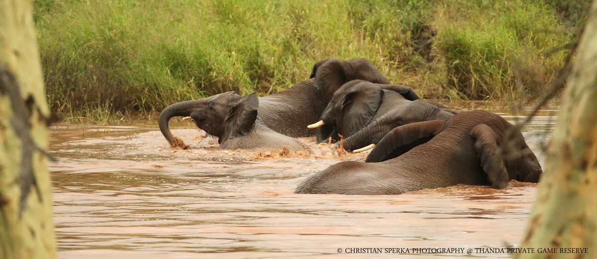 I was sitting at my desk working on images and email when I heard a faint splashing sound from the nearby waterhole, which, due to the recent heavy rains, is full for the first time since I have arrived on Thanda. I had a look out of the window and saw Elephants having a swim. I grabbed a camera with a long lens, walked down to the Thanda house fence and took some pictures of Elephants enjoying themselves in the water.