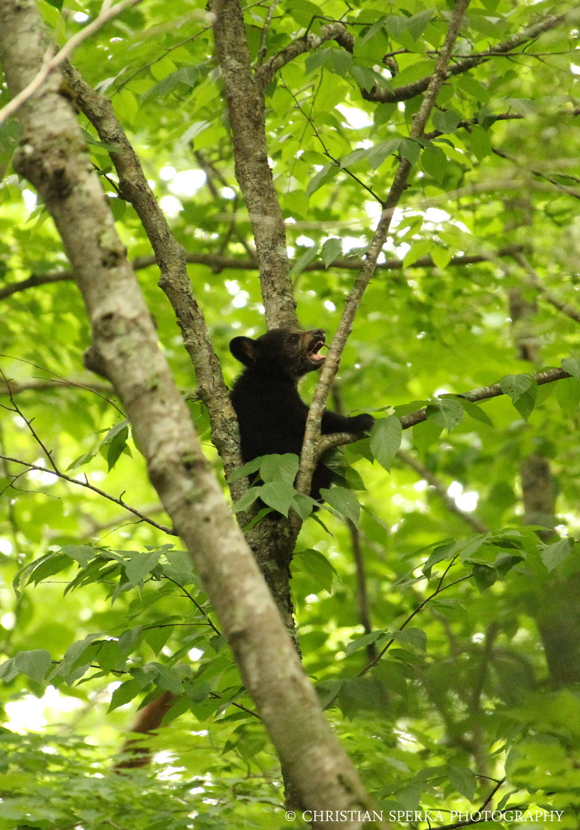 This four-month old bear cub was climbing up a tree while mum was foraging on the ground. It went up and up into the crown of the tree. Many people were watching from the road while the bears gave their “performance”, completely oblivious to their audience.