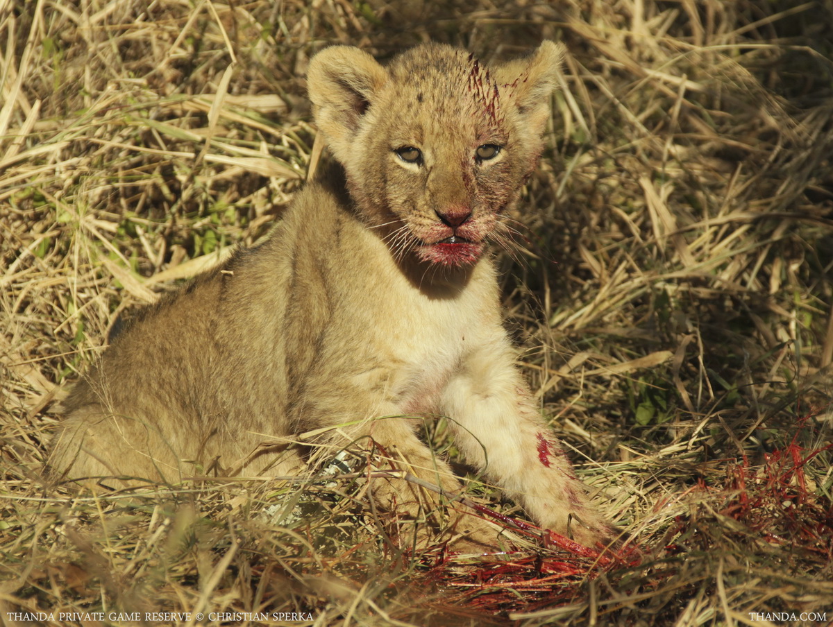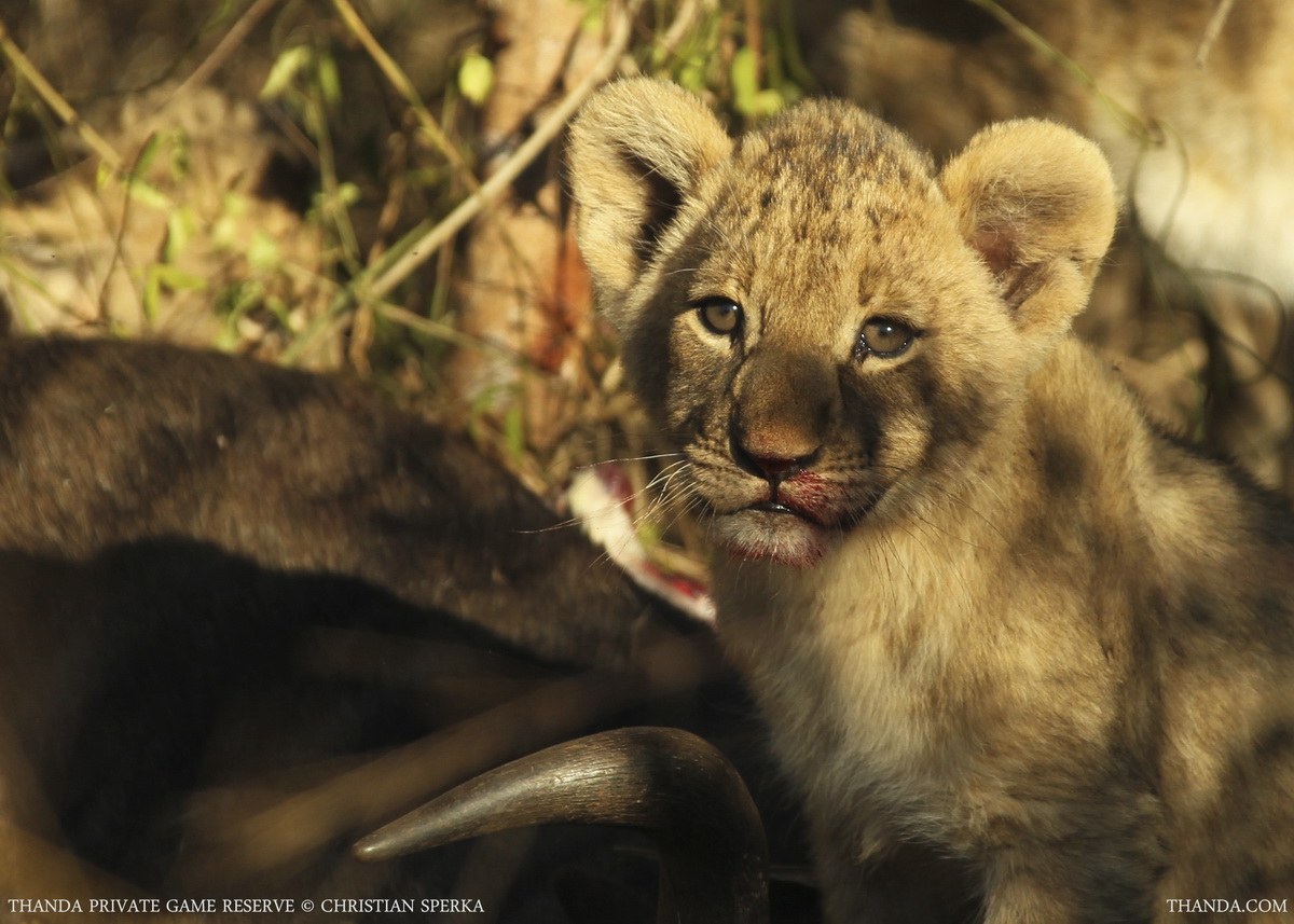 We observed the two Lionesses and their six cubs (three cubs approx 1.5 month old and three cubs approx 2.5 month old) while they had their relaxed meal. The little ones were eating and playing at the same time.