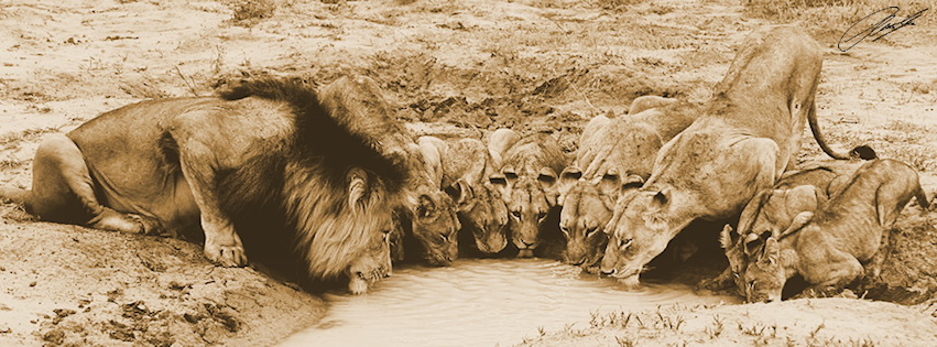 Nice capture of a pride of lions at a watering hole. I count 10, but there seems to be another set of ears in there. 🙂 With the sepia tone you used, it has the feel of an old photo,