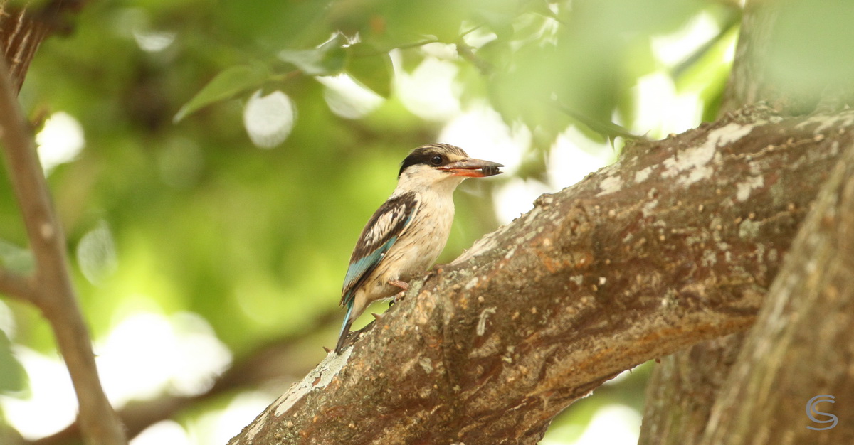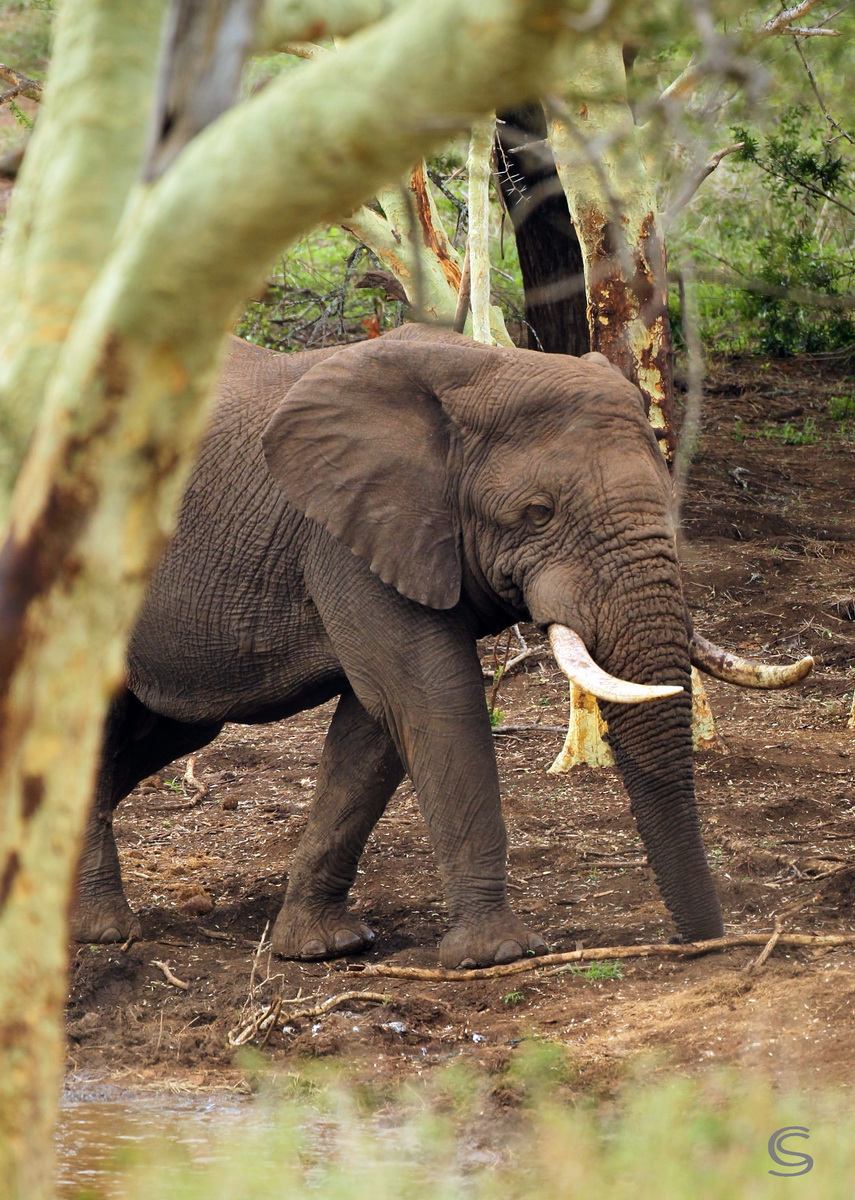 This week, when sitting in my office, I had two repeat guests at Thanda house. On various occasions the breeding herd of Elephants came to drink at the waterhole and Thulani, one of our two large and old Elephants bulls, made his way from the water along the the fence around our garden. And a pair of Striped Kingfishers made their home in our garden. Both birds get very excited about their reflection in my office windows and they knock at them regularly. These good looking little birds are very territorial and obviously not too bright 🙂