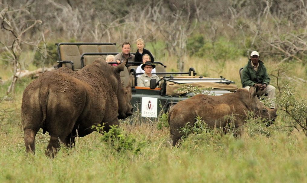 Two of Thanda’s youngest guests observe a young White Rhino calf and its mother. Together with their parents they enjoy a private safari vehicle with one of Thanda’s experienced guiding teams.