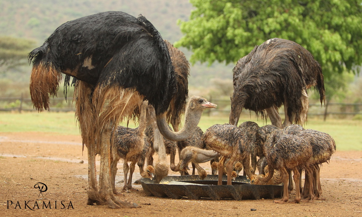 Five weeks old at their evening dinner after heavy rainfalls – The incubation period for ostriches is 35 to 45 days.