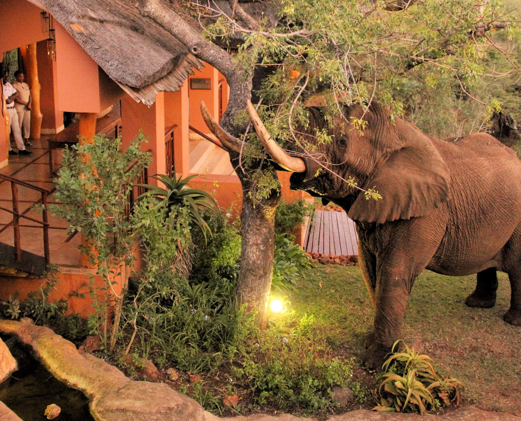 Last night one of Thanda’s largest Elephant bulls showed up at the Thanda Safari Lodge reception. He decided to have a snack at one of the trees in front of lodge buildings. A remarkably uncommon encounter for guests on the way to their suites 🙂
