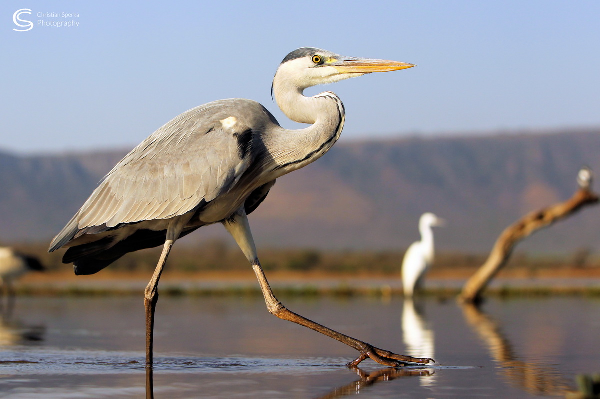 A Grey Heron fishing in the late afternoon light at the Lagoon Hide on Zimanga Private Game Reserve.