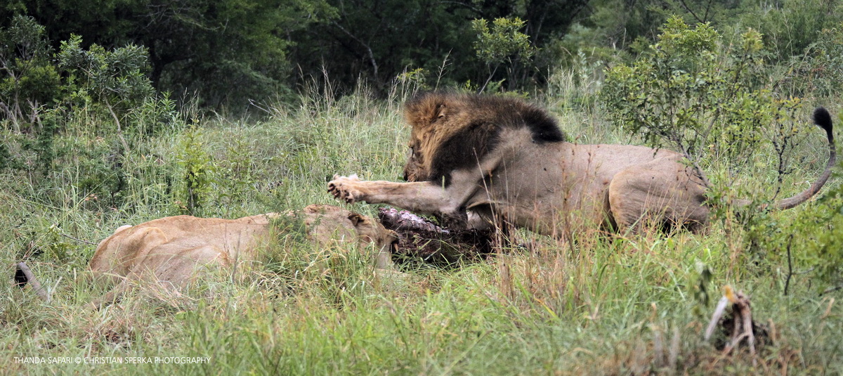 When food is plentiful and the kill is large a pride of Lions will feed without a lot of fuss. But if the carcass is small and there are many Lions it can be a rough meal. If the dominant male is present then he will demand to eat first in peace and quiet. If any other member of pride approaches there will be a lot of growling and if they come to close the huge paws and long claws will come into action.