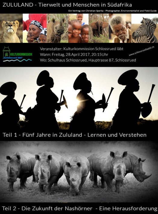 This year a small town in Switzerland has invited me to give a presentation about “ZULULAND – Wildlife and the People in South Africa”. This is a public event on 28 April and anyone is welcome at the presentation. I will talk about my life and my work in South Africa and show some of my pictures. The presentation I will be in German … 🙂 .