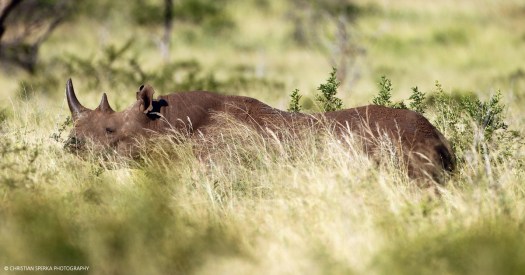 This is a very typical profile view of a Black Rhino. Heads up, ears forward and alert, nostril wide and ready for action.