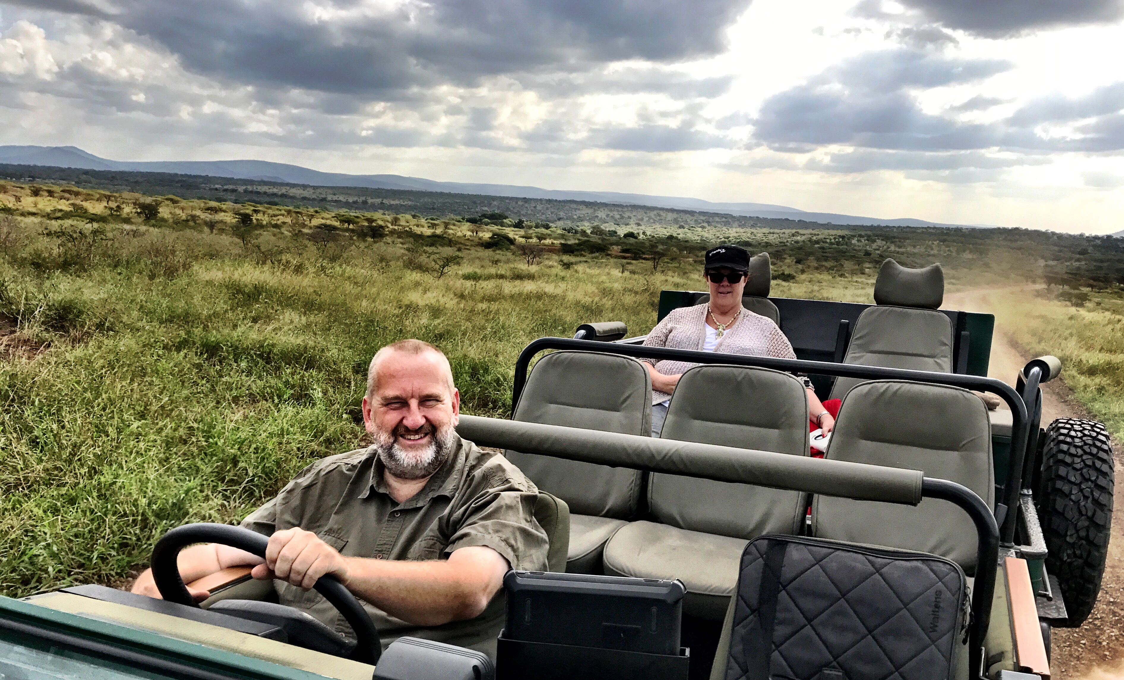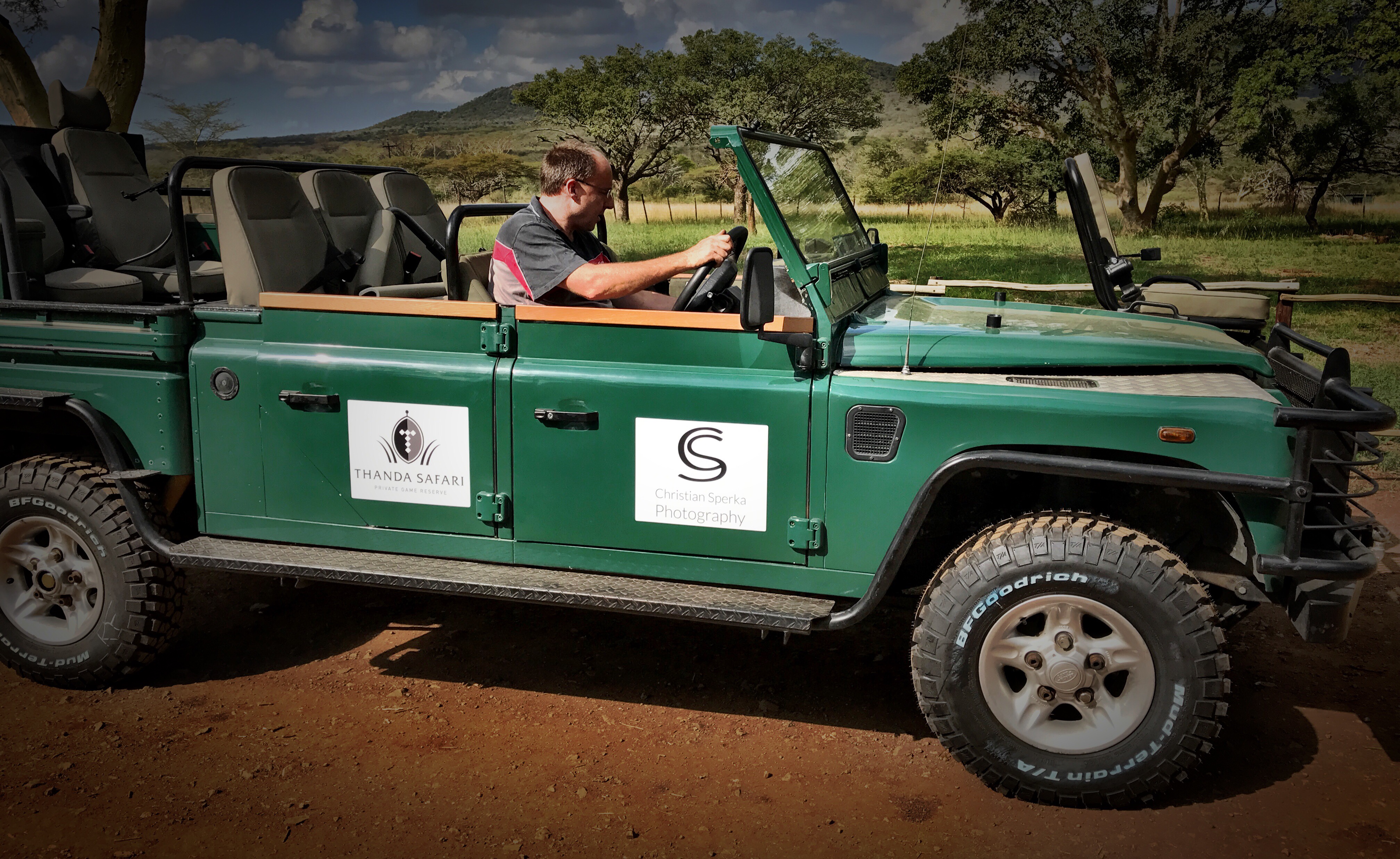 The Green Mamba’s maiden voyage to the Thanda Safari Lodge (with me and Marian in the vehicle and Garry on the tracker seat) …