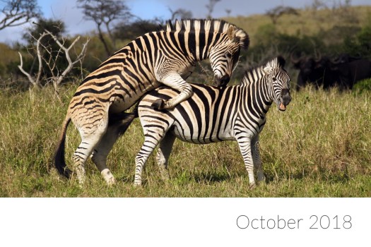 October: A bit of hanky-panky in spring. The most natural thing in the world. Making new Zebras! Note the Buffalo in the background watching with interest.