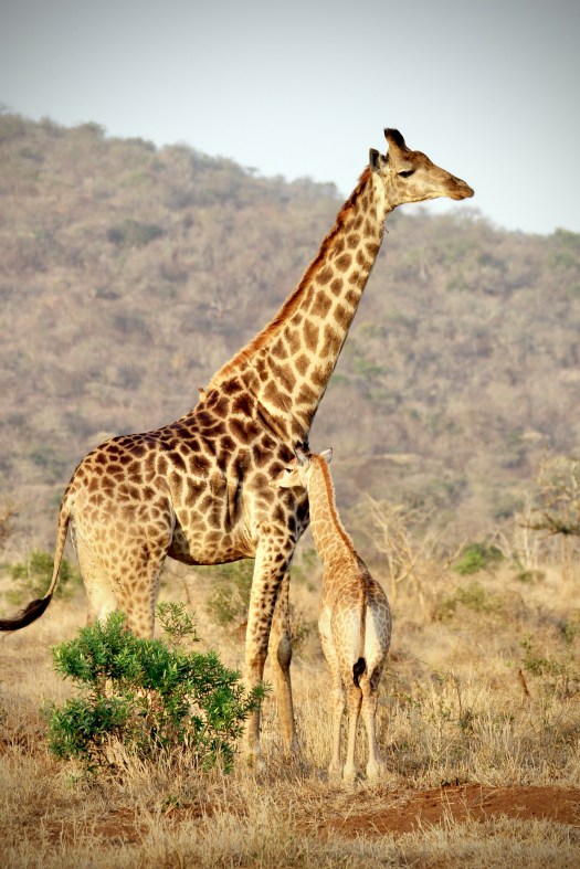 A newborn South African Giraffe is ~1.8m (~6ft) tall. After a few hours of birth, the calf can run and is almost indistinguishable from a one-week-old.