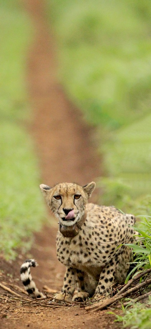 These pictures of a Cheetah female – watching a two male coalition down the road and meeting them – were taken at Thanda Safari.
