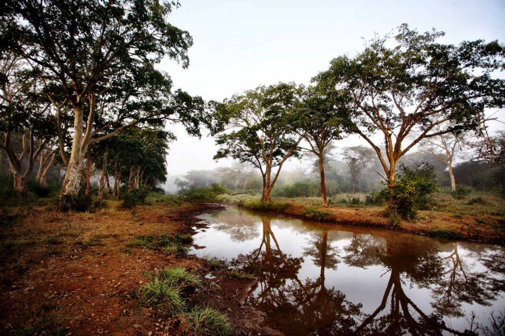 It was quite foggy and very chilly when I drove this morning to one of the more remote waterholes on Thanda Safari. I spent there a few very quiet hours listening to bird sounds all around me. Only one old Buffalo Bull was coming to drink.