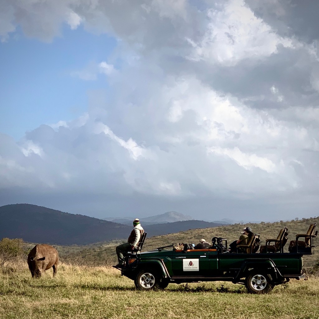 It is hard to envision a more dramatic setting – a beautiful White Rhino sighting under a cloudy sky in front of the rolling hills of Zululand.