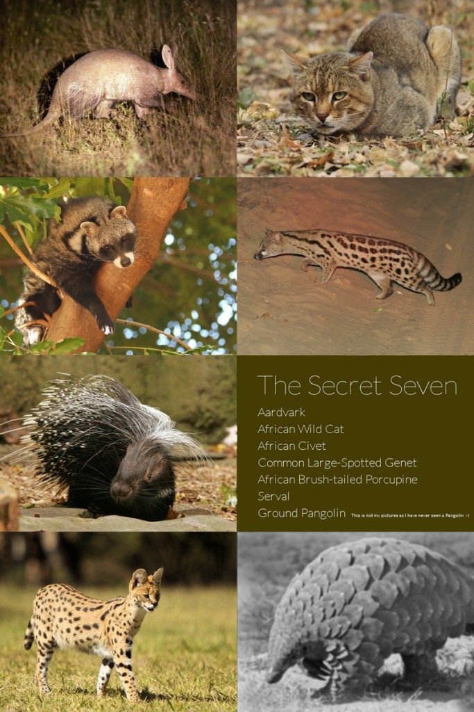This is a collage of a more unusual grouping called the Secret Seven. These mammals are very hard to find and are on the sighting wish list of most regular safari goers. I have seen six of the seven – on very rare occasions – in my 20 years of safaris. The only one I have never seen is a Pangolin 😊