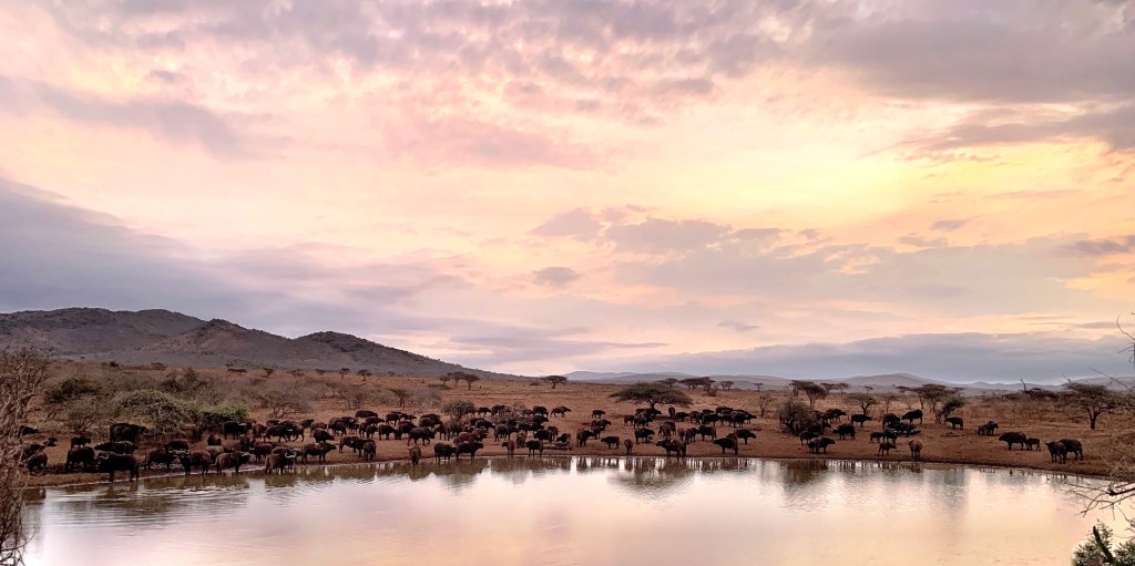 After a day in the office I decided to spend an hour before sunset at Mgankla dam. It was very quiet at the waterhole so I decided to listen to an audio book. After about 30 minutes all by myself I heard a slight rumble. It was the start of a large herd of Cape Buffalo arriving for evening drinks.