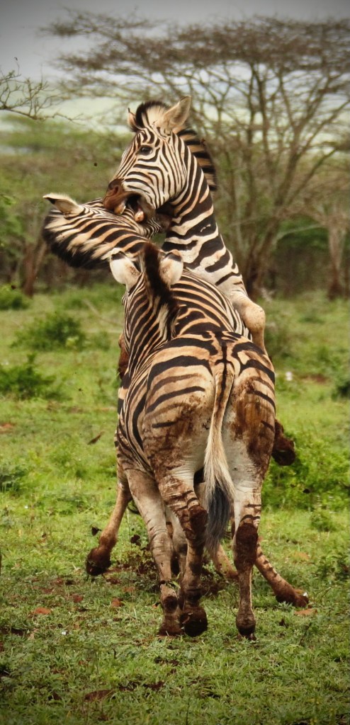 Zebras can be quite ferocious fighters. Still muddy after last night’s rain and from the subsequent mud bath these two Burchell’s Zebra stallions had a go at one another.