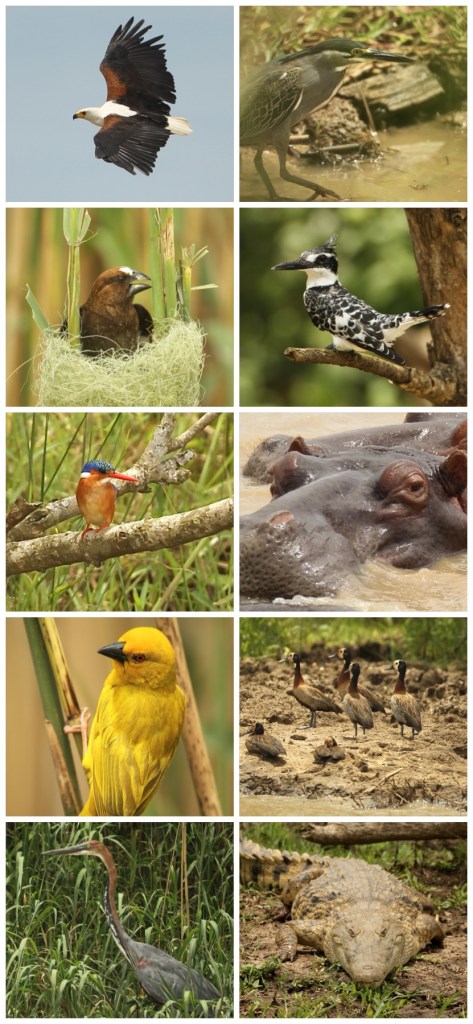 Besides Hippos which are the main feature of the these cruises we saw Nile Crocodiles, a Giant Heron, a Malachite Kingfisher, a Pied Kingfisher, a Striated Heron, White-faced Whistling Ducks, multiple Fish Eagles, and many other Weaver species.