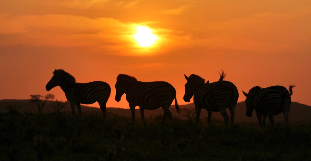 Silhouette of a dazzle of Burchell’s Zebras on Thanda Safari’s savanna.