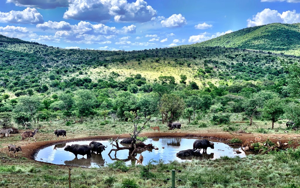 This is the view from the waterhole-deck at Thanda Safari’s Villa iZulu – While my guests were relaxing while watching the wildlife come and go a few Cape Buffalo bulls were also relaxing around the water.
