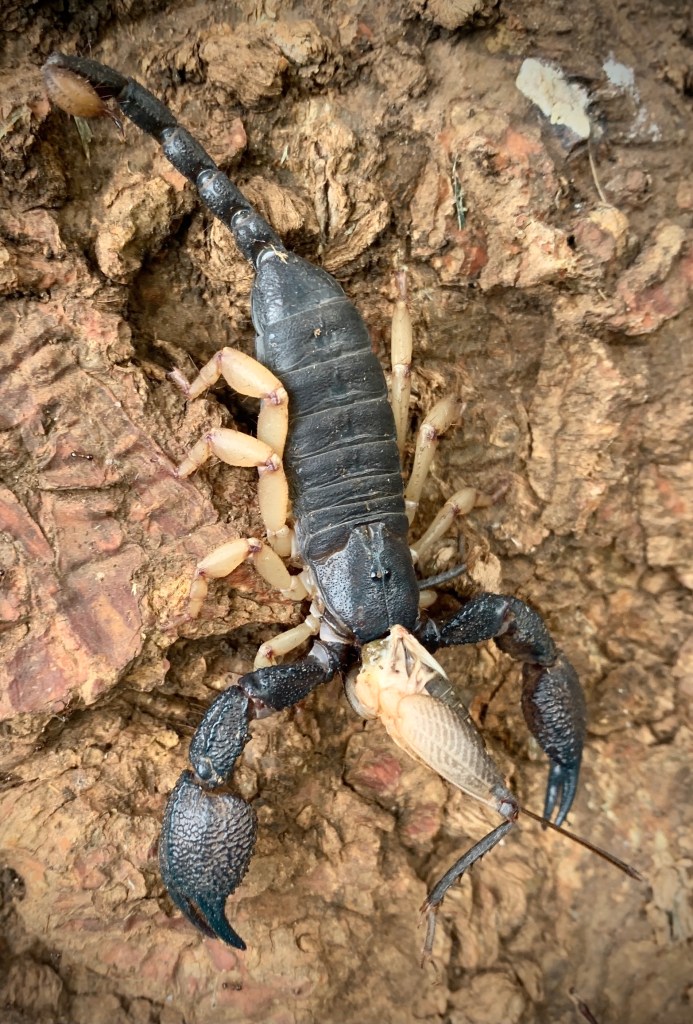 When I picked up a stone which was resting against a tree in the Thanda House garden I interrupted this Scorpion having his Grasshopper-meal. It was fascinating to watch him trying to find a new hiding place to finish his dinner in peace and quiet.