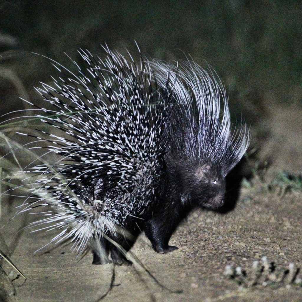 On the way back from a ‘Pakamisa Birding Weekend Owl spotting night drive’ we encountered this African brush-tailed Porcupine and its mate. It was quite relaxed and posed for a few pictures in the spotlight which is unusual for these prickly rodents. Its partner disappeared very quickly into the bush 😊