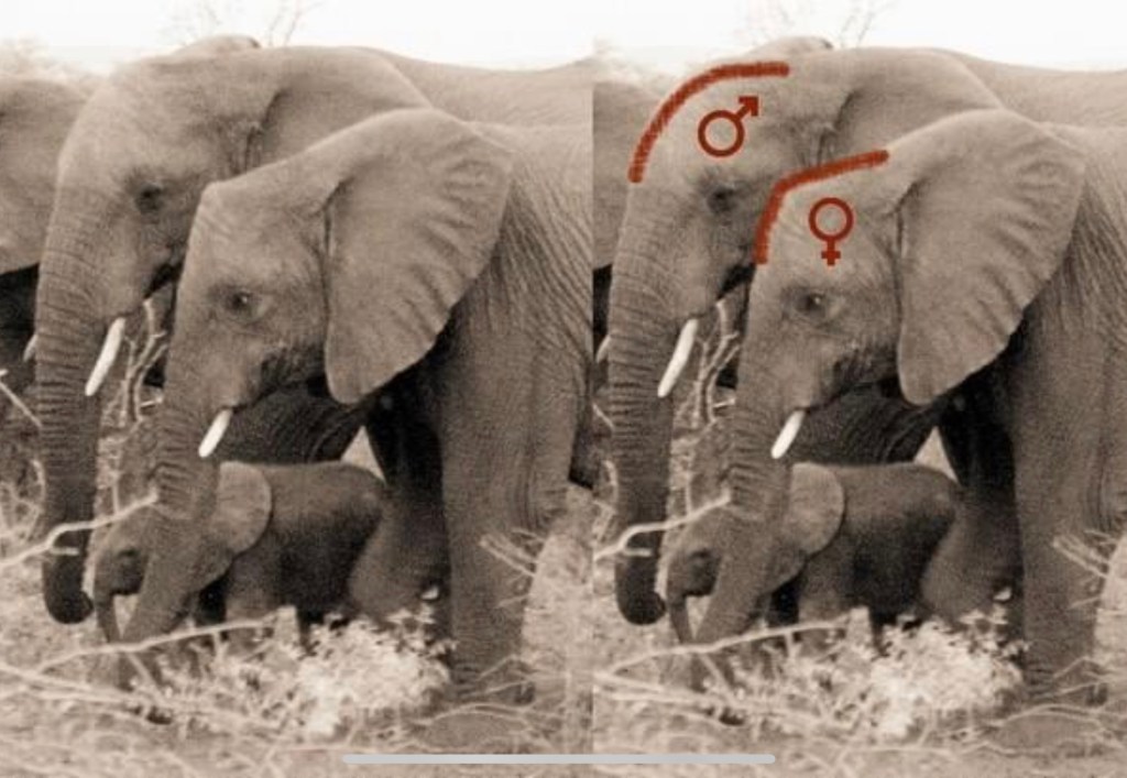 One of the ways to distinguish a female Elephant from a male is the look of the forehead. Ladies’ skulls have a rather sharp edges. The Gentlemen’s are more rounded. Looking from the side (as in this picture) one can see the edges.