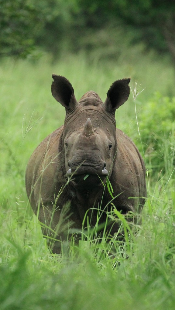This young Rhino is already eating lot of grass even if it begs its reluctant mum for some milk from time to time.
