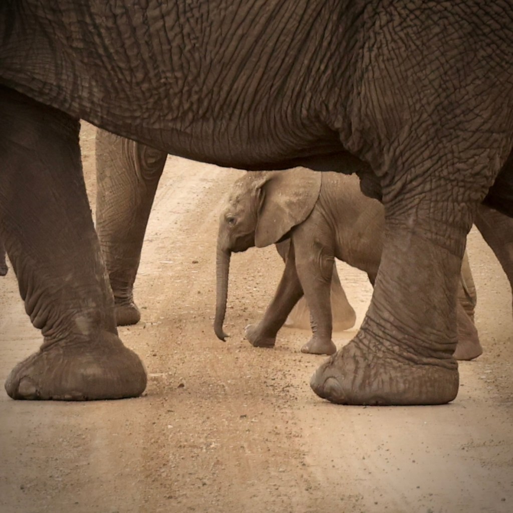 I was very lucky to get this shot of Thanda Safari’s largest and smallest Elephant crossing the road together.