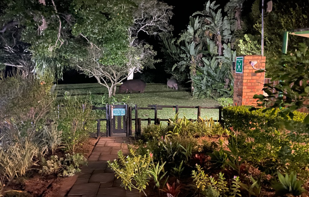 When we returned for dinner to my favorite guest house in St.Lucia (Serene Estate Boutique Guest House) two Hippos were grazing quietly in the garden beyond the pool.