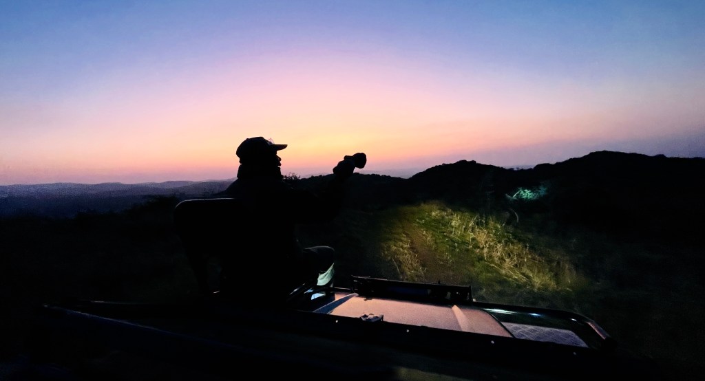 Before we had visited Durban, iSimamgsliso Wetland Park and Pakamisa Private Game Reserve. This colorful picture of my tracker Bheki Ngubane I took last night after the sun had set!
