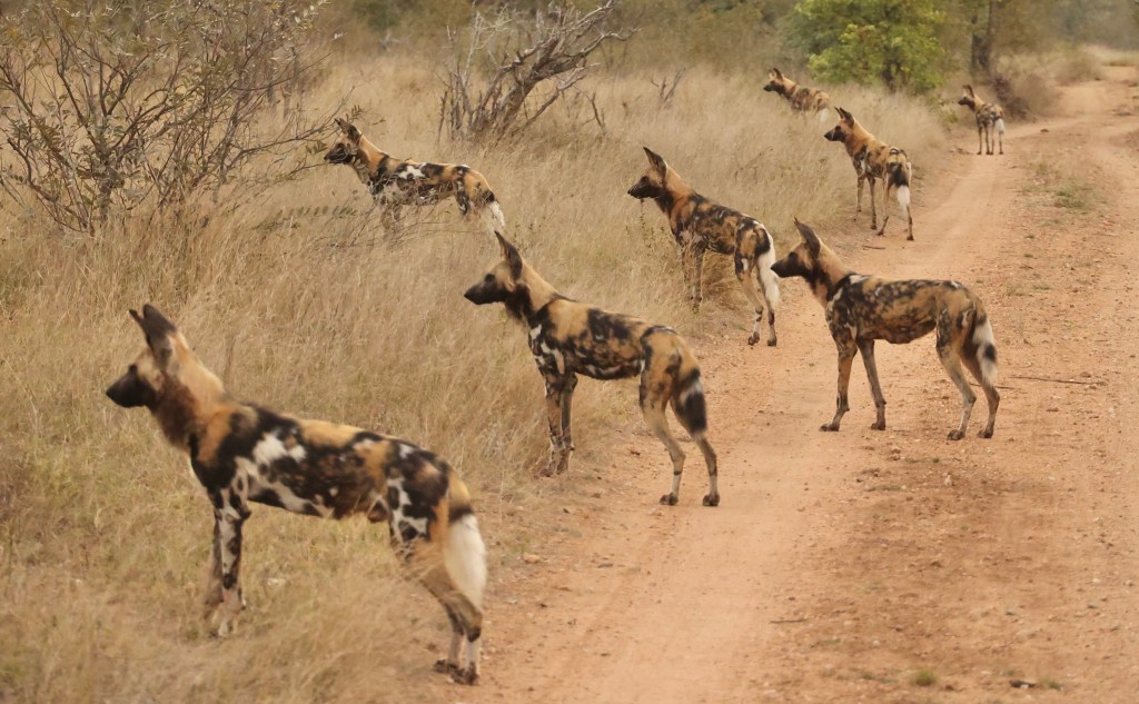 After a very quiet morning drive the afternoon one was ‘pumping’. We followed a large pack of African Wild Dog hunting. They were trailed by Spotted Hyena and Vultures. After the dogs encountered two angry Elephants and a not less angry herd of Cape Buffalo the Hyenas stole the fresh kill from them. An action filled afternoon! This pictures shows some of the dogs focused during their hunt.