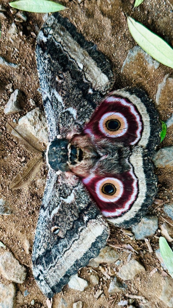This morning a beautiful Speckled Emperor Moth (_Gynanisa maja_) settled next to the back wheel of my game viewer when I was able to take this shot with my phone. This impressive species is one of the largest moths on earth with a wing span of over 100mm (4″).