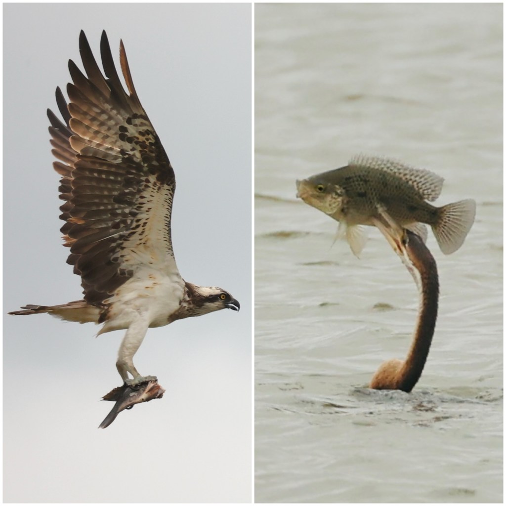 The picture on the left shows an Osprey in flight with the remains of a fish in its talons. The picture on the left depicts a African Darter with a freshly speared fish.