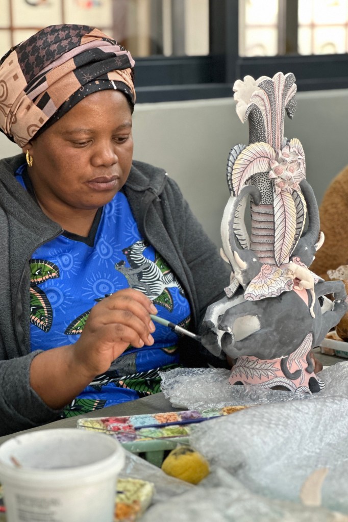 While traveling South to enjoy the beautiful setting and excellent cuisine of Cleopatra Mountain Farmhouse, where we stayed the next three days, we visited The Platform Gallery with contemporary South African art, and Ardmore Ceramic Art. It was most interesting to observe the local Zulu artists creating incredible ceramic art.