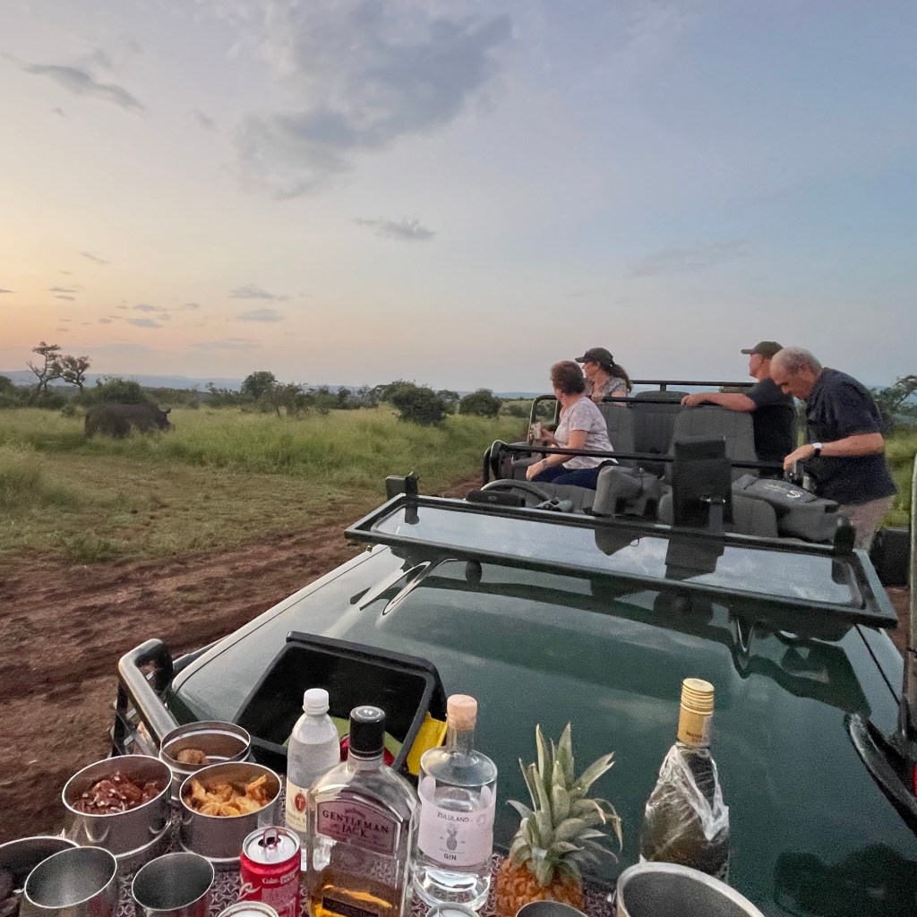 Using the Green Mamba II, we embarked on many game drives on the reserve, enjoyed morning cappuccino from the bush barista (=me), and ended the days with a Zululand pineapple gin & tonics as the sun set. And one of these drinks stops was even interrupted by large White Rhino bull, which led to a speedy retreat onto the vehicle.