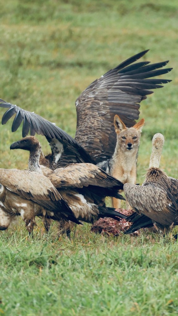Topic: A Black-backed Jackal is trying to get his share from a recent (Cheetah) Impala kill, as many White-backed Vultures compete for the remains of the antelope.