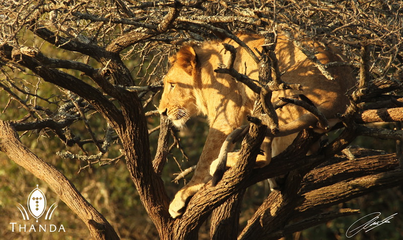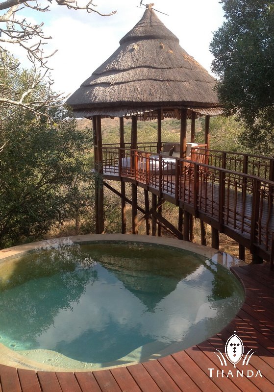 In the early afternoon I had an excellent massage at Thanda’s beautiful spa and then a relaxing break at one of the guest rooms (called villas, a much better name for those luxurious rooms), where I will also spend my birthday night. I am sitting in the lounge now writing this blog message. Dinner is soon to be served, and I am looking forward to it. The picture below shows the small pool and the the “day-bed in the trees” of my villa.