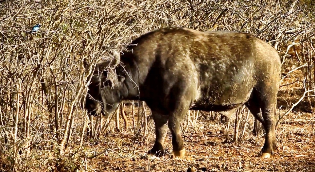 … is the term for an old Cape Buffalo bull who is no longer with a herd. As this specimen demonstrated last night at Thanda, such bulls love to wallow in mud as means to cool down and to give them some protection from parasites and the sun.