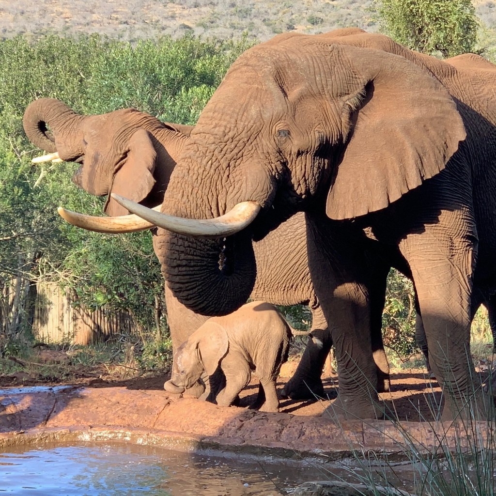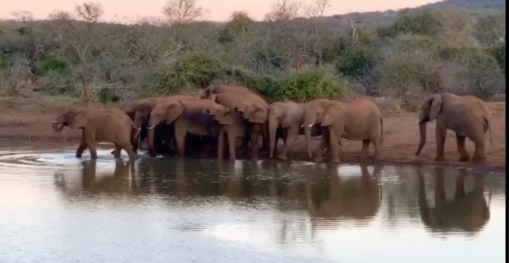 One of Thanda Safari’s breeding herd of Elephants had a morning drink at the Safari Lodge. This is a short video of the smallest calf with its tiny trunk and the largest bull with his impressive tusks.