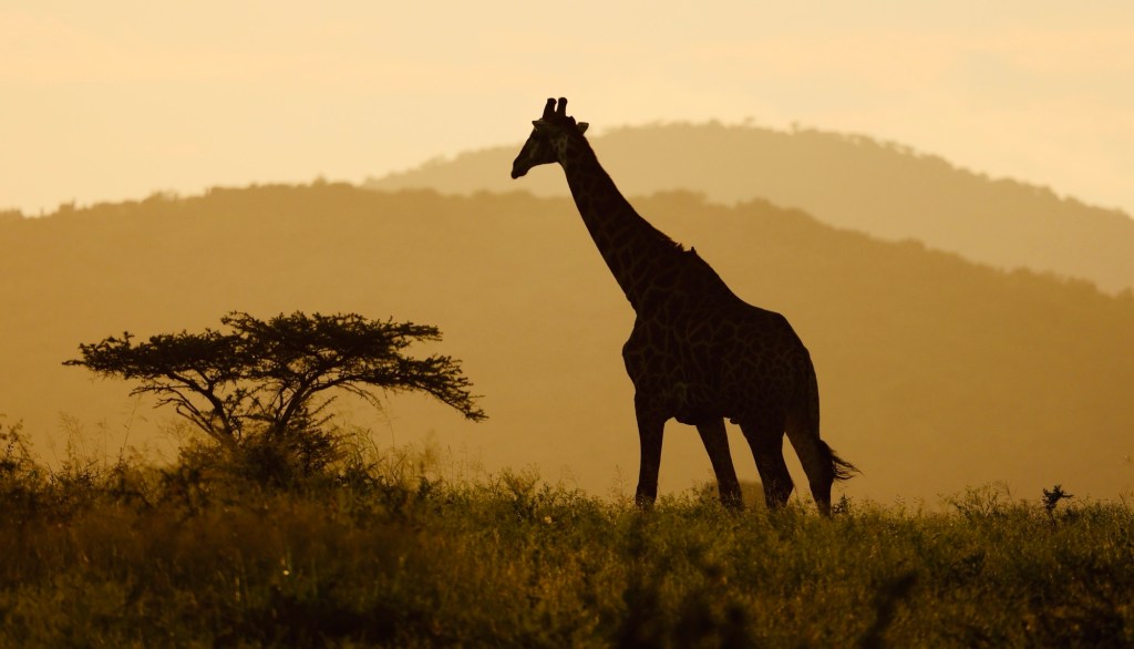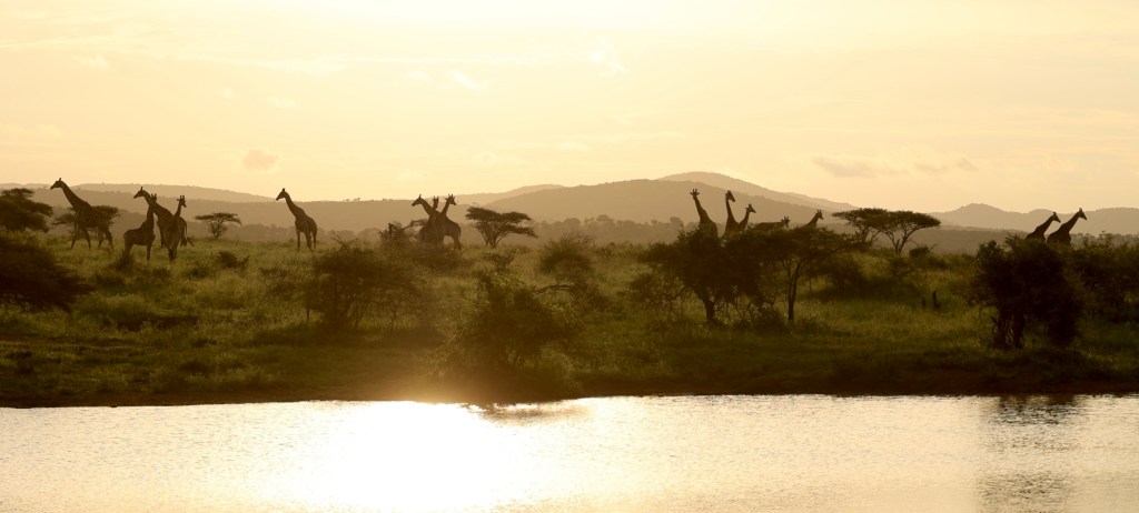 … of fifteen Giraffe. Last night I was at the right time at the right place to take this picture of a few of the world‘s tallest land mammals in front of a waterhole, on a savanna, and with the rolling hills of Zululand in the background.