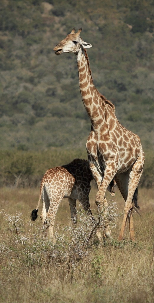 I took this picture when the Giraffe mum was in a hurry to get to the waterhole and the little one was trying to get a drink at the same time.